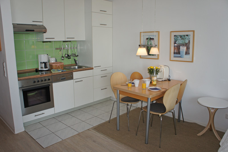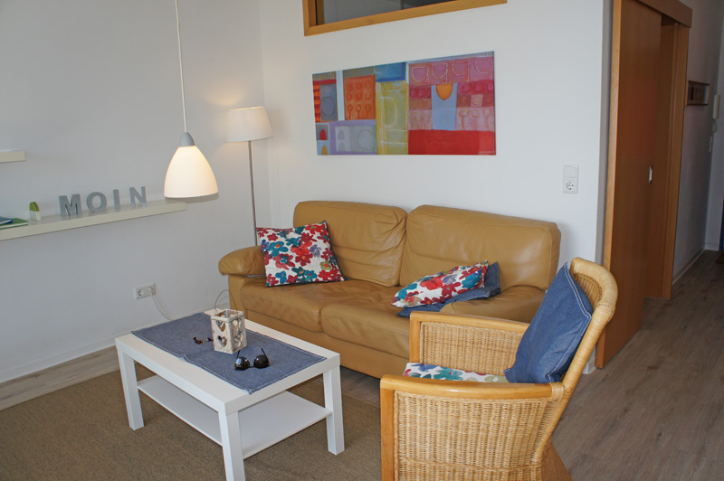 Der großzügige, helle Wohn-/ Essbereich entspricht in seiner Ausstattung gehobenen Ansprüchen. Von dort aus gelangen Sie auf den gemütlichen Balkon mit einem traumhaften Meerblick. Hier können Sie morgens frühstücken und bis mittags die Sonne genießen. Elegante Möbel, frische Farben und liebevolle Details sorgen für eine Atmosphäre zum Wohlfühlen. Der Raum verfügt über eine gemütliche Sitzecke mit Ledercouch und Korbsesseln, eine Essgruppe mit Ausziehtisch, einem bequemen Doppelbett, SAT-TV, Radio-CD -Anlage. Die moderne und funktionale Küchenzeile ist zusätzlich mit einer Spülmaschine ausgestattet.